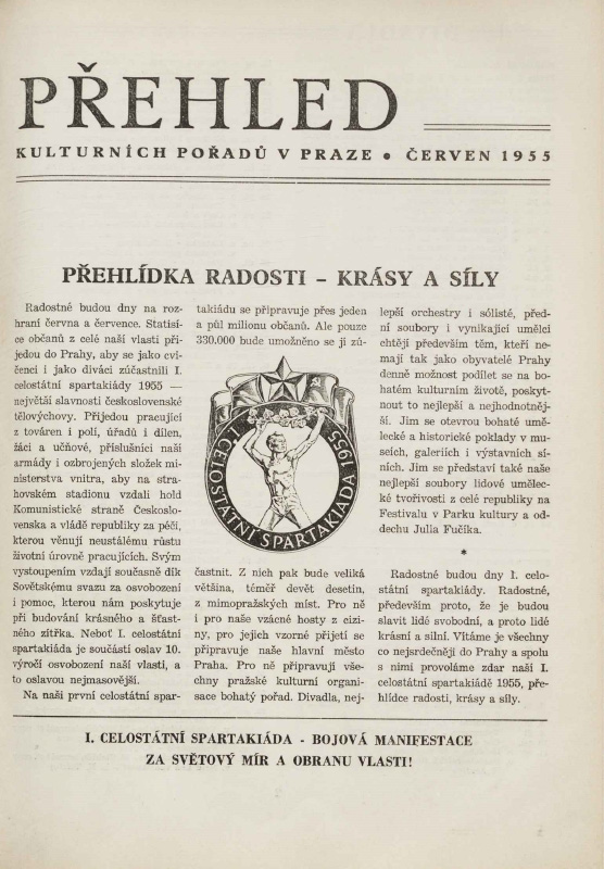 Radostné budou dny I. celostátní spartakiády. Radostné především proto, že je budou slavit lidé svobodní, a proto lidé krásní a silní. Vítáme je všechny co nejsrdečněji do Prahy a spolu s nimi provoláme zdar naší I. celostátní spartakiádě 1955, přehlídce radosti, krásy a síly.
