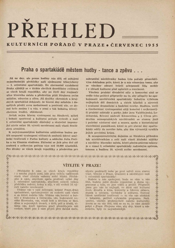 Přicházíte k nám ze všech krajů republiky, i z mnoha jiných zemí, kde přes velkou vzdálenost stará vlast zůstala vašemu srdci blízká. Přicházíte k nám, abychom spolu prožívali velké dny I. celostátní spartakiády, abychom oslavili velkou přehlídku radosti, krásy a síly, v níž vrcholí 10. výročí našeho osvobození.