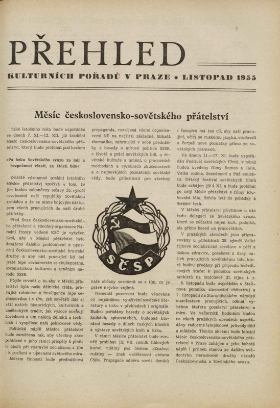 Před Svaz československo‑sovětského přátelství a všechny organisace Národní fronty vedené KSČ je vytyčen úkol, aby v Měsíci přátelství bylo dosaženo dalšího prohloubení a upevnění československo‑sovětské bratrské družby a aby náš pracující lid byl ještě lépe seznamován se zkušenostmi, socialistickou kulturou a uměním národů SSSR.