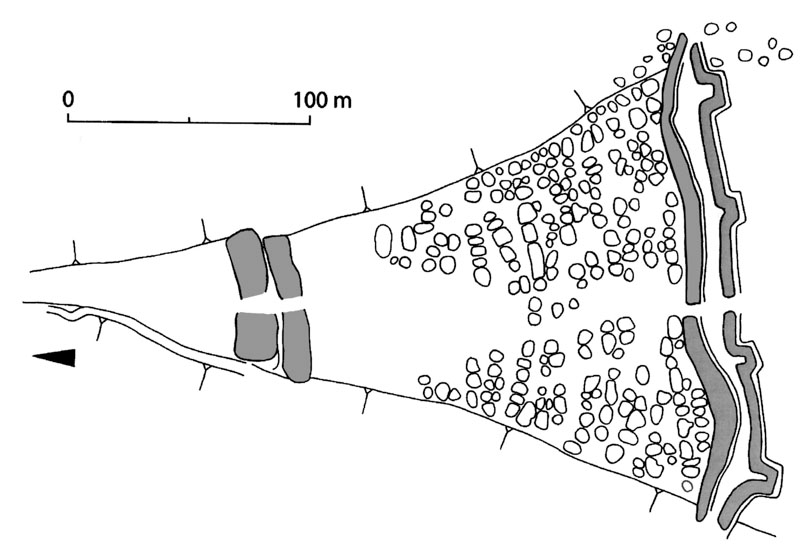 Plošina před hradem je na dvou místech přerušena výraznými pásy zemního opevnění tvořeného příkopem a nasypaným valem. Západní opevnění je tvořeno dvěma mohutnými zemními valy a mezilehlým mělkým příkopem. Z jižního okraje opevnění na straně proti hradu vybíhá přibližně devadesát metrů dlouhý přibližovací příkop obléhatelů – tzv. sapa, který umožňoval obléhatelům krytý přístup přímo k předpolí hradu. Východní opevnění o délce až sto devadesát metrů sestává rovněž ze dvou valů s mezilehlým příkopem. Mohutný vnitřní val je několikrát zalomený, zatímco subtilnější vnější val je na čtyřech místech opatřen čtyřmi vystupujícími baštami, které byly patrně opatřeny lafetovanými zbraněmi. Opevnění vymezuje plochu tábora o rozloze téměř dva a půl hektaru, která je poseta především ve východní části (dále od hradu) četnými obdélnými či kruhovými jámami, které jsou pozůstatkem zahloubených příbytků obléhatelů.
