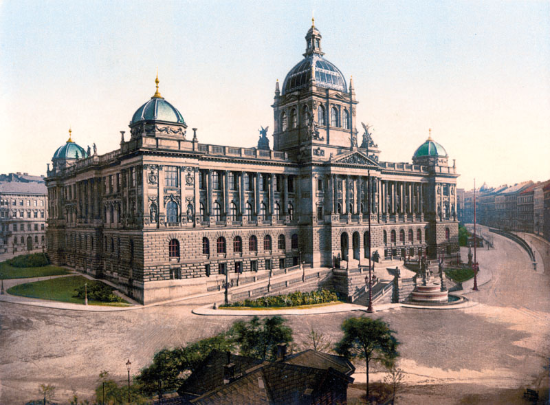 V červnu 1820 udělil císař František I. souhlas k založení muzea a po dalších dvou letech byly schváleny stanovy Společnosti Vlasteneckého muzea v Čechách. Jejím prvním prezidentem byl zvolen v prosinci 1822 hrabě Kašpar Mária ze starobylého rodu Sternbergů. Základem muzejních sbírek se staly různorodé dary jako rukopisy, přírodniny, tisk, památky hmotné kultury aj. Nejdříve byly shromažďovány v minoritském klášteře sv. Jakuba na Starém Městě i v soukromých bytech. Prvním stálým sídlem muzea se stal Šternberský palác na Hradčanech (1819). Roku 1840 vypracoval František Palacký návrh na zbudování novostavby muzea, které mělo být postaveno na dnešním Smetanově nábřeží pod názvem Francisceum (na paměť císaře Františka I.). Projekt byl nakonec zredukován na pouhý pomník. Muzeum se tedy přestěhovalo roku 1846 do Nostického paláce na Příkopě, který však po nějaké době nedostačoval. Dalším nápadem bylo postavit muzeum nové na Karlově náměstí. Nakonec ale až v roce 1876 po návrhu Fr. L. Riegra darovala městská rada pro novou budovu velmi cenný a výhodný pozemek na horním konci Václavského náměstí. Veřejný konkurz na muzejní stavu byl vypsán v roce 1883, vítězem se stal architekt Josef Schulz. Náklady na novou budovu muzea dosáhly úctyhodných asi dvou milionů zlatých.
