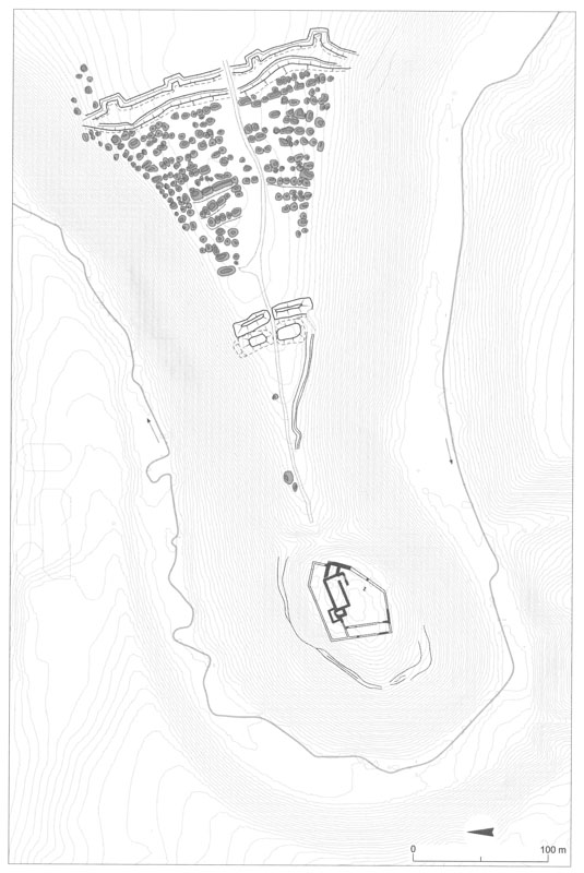 Hrad zaujal vyvýšené místo na konci dlouhého ostrohu, který na třech stranách obtéká Kunratický potok. Z východu vedla jediná přístupová cesta od Chodova v ose ostrožny, která byla před hradem přeťata do skály vylámaným příkopem. Přes tento příkop bezpochyby vedl most, po jehož překonání se návštěvník rovnou ocitnul ve vlastním jádře hradu. Jako hrad královský totiž tento hrad postrádal nezbytné hospodářské zázemí v podobě předhradí, kterými byly vybaveny především hrady šlechtické.