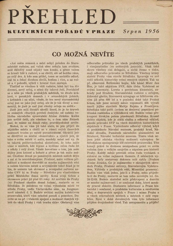 Možná, že se vám již také stalo, že jste přijeli do nějakého města a chtěli jste se v rámci svých časových možností trochu po městě porozhlédnout. Obrátili jste se důvěřivě na místní „domorodce“ a zjistili jste, že toho o svém městě ví málo, mnohdy méně než vy. Je to taková politováníhodná skutečnost, že toho málo víme o místech, kde žijeme a bydlíme celou řadu let a někdy i celý život. Všude hovoříme o tom, jak naše dějiny jsou krásné a bohaté a přece je tak málo známe. Chodíme denně po památných místech našich dějin a ani si to neuvědomujeme. Pražané, máte velikou příležitost a možnost dozvědět se mnoho zajímavých věcí o našem hlavním městě a nevyužíváte toho! Snad je to tím, že neznáte tak skromné a nenápadné zařízení našeho ÚNV hl. m. Prahy – Středisko pro vlastivědnou práci Městského domu osvěty. Koná svoji tichou a skromnou práci již plné tři roky. Až zavítáte do Prahy (vy Pražané chodíte denně kolem), zastavte se ve Středisku. Je položeno na velmi výhodném místě ve středu Prahy, vedle Václavského nám., na Jungmannově náměstí č. 3. Budete uvítáni malým kolektivem pracovníků, kteří vám ochotně poradí a pomohou. Radíme vám však jedno, jste‑li z Prahy, nebo přijedete‑li do Prahy, zastavte se tam nebo zavolejte tel. čís. 24-12-69. Budete skutečně mile překvapeni a dozvíte se mnoho zajímavostí i ze současné doby, které mnohdy pracně sháníte. Dostanete informace o Praze historické i současné, o pražském kulturním a osvětovém dění, o dopravních spojích v Praze i mimo Prahu a o všech rekreačních místech a městech v celé republice. Nyní v době dovolených vám tyto informace přijdou dvojnásobně vhod. Tak nezapomeňte a přijďte!