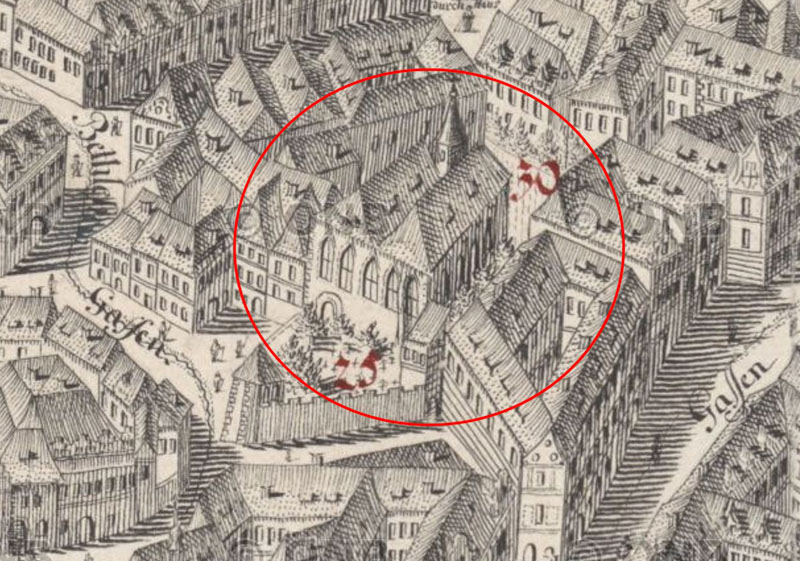 Již jsme akcentovali, že kaple byla v závěru 14. století postavena do již zformované měšťanské zástavby, což do značné míry ovlivnilo její podobu. Postavena totiž byla na zahradě za dvorem Křížova domu č. p. 238 a 239, jehož románské i gotické pozůstatky dnes nacházíme v domech při Husově ulici. Situaci staveniště se musel přizpůsobit i nepravidelný půdorys kaple, její osvětlení i situování vstupů, které se muselo vyrovnat s existencí staršího kostela a pohřebiště na jižním okraji staveniště.