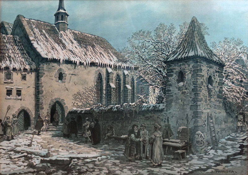 „Nástěnné malby v kapli pocházejí rovněž až z padesátých let 20. století, ale dobře ilustrují její původní barvitou výzdobu popisovanou písemnými prameny. Obrazy i texty totiž byly přejaty z Jenského kodexu, Reichenthalovy kroniky, Velislavovy bible či Jistebnického kancionálu.“