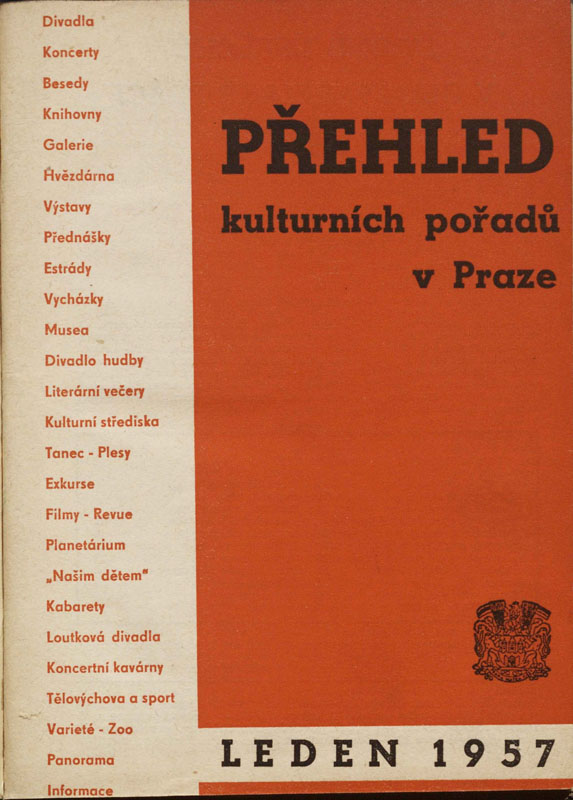 My, lidé lidově demokratického Československa, již dvanáctý rok budeme užívat svobody svého samostatného státu, která rok od roku nám dává stále bohatší a bohatší život z úspěchů společné budovatelské práce. Náš radostný život dochází svého výrazu i ve chvílích odpočinku po práci. Je stále vyplněn krásnějšími prožitky z uměleckých večerů našich umělců z povolání i lidových umělců. Stále větší počet našich lidí tráví většinu svého volného času v pěveckých, tanečních, divadelních a dalších kroužcích nejrozmanitějších zájmů v závodních klubech, nebo v kulturně osvětových zařízeních národních výborů. Proto každý měsíc roku v Přehledu není úplným výčtem celého kulturně společenského života hlavního města. Ukazuje však jeho hlavní pořady. Pro každou chvíli volného času každého z nás je připraveno tolik možností kulturně společenského života, jaký jen může poskytnout socialistická péče o člověka.