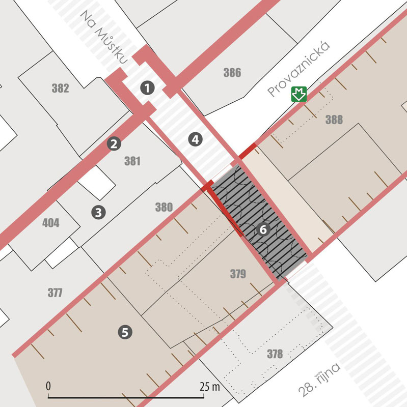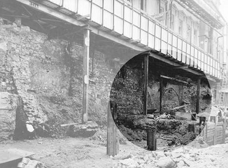 Kromě dvou dodnes dochovaných věží na dvorech v Bartolomějské ulici, o těch snad někdy příště, se pozůstatky nejstaršího kamenného opevnění Starého Města dochovalo výhradně pod úrovní dnešního terénu, o čemž svědčí početné archeologické výzkumy, které jeho průběh dokáží dnes již vcelku spolehlivě rekonstruovat. Je nutno zdůraznit, že opevnění bylo budováno v době, kdy historické jádro pražské sídelní aglomerace již bylo poměrně intenzivně zastavěno a městské hradby tak byly zakomponovány do mnoha starších historických objektů, sakrálních staveb, avšak některé z těchto staveb také musely novému hradebnímu okruhu ustoupit. V trase výše zmíněných ulic, před vlastním vyzděným příkopem opevnění, byly v době jeho výstavby ještě patrné pozůstatky postupně se zanášející vodoteče, či strouhy, která plochu Starého Města vymezovala ještě dávno před jeho faktickým vznikem. Pozůstatky, respektive koryto této vodoteče, byly zjištěny na mnoha místech a rovněž i při výstavbě vestibulu stanice Metra Můstek v průběhu roku 1976.