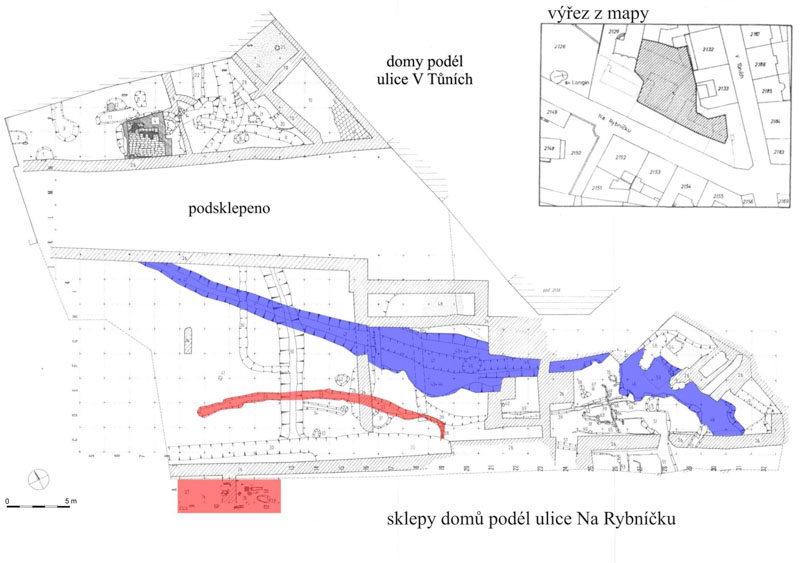 To až tak velkým překvapením nebylo, tím naopak byla situace severně odtud, kde byla archeologickým výzkumem prozkoumána přírodní tůň napájená vydatným potokem směřujícím napříč zkoumanou plochou od křižovatky ulic Na Rybníčku a V Tůních směrem ke křížení Štěpánské a Žitné ulice. Nepravidelný útvar tůně o rozměrech přibližně 6 x 12 metrů byl vyplněný náplavovými vrstvami proloženými životními nečistotami s keramikou průběhu 12. a 13. století. Prostředkem tohoto rybníčku vedla v této době uměle vyhloubená přímá strouha s jímkou na jímání vody vedoucí směrem dolů k již zmíněné křižovatce Žitné a Štěpánské ulice. Strouha nejspíše zásobovala vodou vlastní středověkou osadu ležící o něco níže. Do rybníka taktéž ústila jedna menší a jedna větší vodoteč vedoucí z výše položeného rybníka doloženého geologicko‑inženýrským průzkumem v čelní frontě ulice Na Rybníčku.