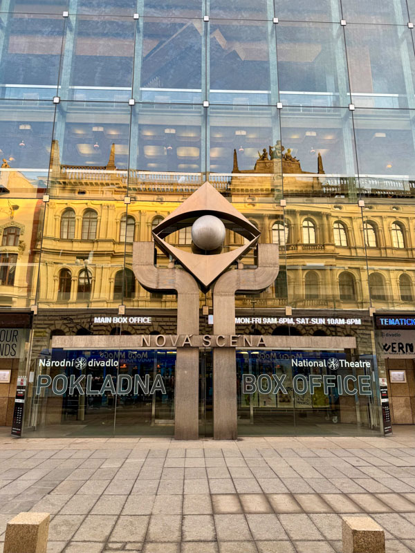 V okolí Národního divadla se nenacházel volný prostor a bylo tak třeba bourat, aby se mohla uskutečnit plánovaná dostavba nových budov. V roce 1959 došlo k demolici Kaurových domů, tvořících součást Národní střídy. Byla vypsána soutěž, kterou v roce 1964 vyhrál se svým návrhem Bohuslav Fuchs a jeho kolektiv. Tehdy však zadání ještě nepopisovalo divadelní budovu, ale spíše společenskou. Dnes bychom požadavek vystihli spíše výrazem multifunkční. Architekt Bohuslav Fuchs však v roce 1972 zemřel a jeho kolektiv se práce vzdal. Práci na dostavbě převzal tým Pavla Kupky, Iva Loose, Jany Hrdličkové, Bohumila Blažka a Markéty Lierové. Tou dobou se již jednalo o tři budovy. Ve dvou z nich byly technické provozy, které nemohly být umístěny v historické budově a nepočítala s nimi ani budova Bohuslava Fuchse. Dnes je obě můžeme vidět z náměstí Václava Havla. V roce 1980 bylo naprosto zřejmé, že bude potřeba někoho, kdo zvládne práce na dostavbě ve stanoveném termínu. Ten byl určen na 18. listopadu 1983, tedy ke stému výročí Národního divadla. Dvě budovy již byly prakticky hotové, ale ta s průčelím do Národní třídy nikoliv. Na jejím místě stála jen mostová konstrukce. Tím, kdo měl dostavbu zachránit a režim tak ušetřit ostudy, byl Karel Prager. Kromě působivého návrhu totiž jako jediný z oslovených architektů nijak nezpochybňoval možnost dokončení do stanoveného data. Měl na to 1,5 roku a dostal zcela nové zadání. Mělo jít konečně o divadlo, ale podmínkou bylo využití stávající konstrukce, která se už na místě nacházela. Prager se při konstrukci budovy rozhodl využít systému FEAL, který umožňoval zavěšení obvodového pláště z kubánského hadce, což je hornina podobná mramoru. Bylo prakticky nutné ho využít, jelikož ho Československo obdrželo velké množství, pravděpodobně výměnou za traktory. Avšak plášť neměl dostatečné akustické vlastnosti. Z Národní třídy do sálu pronikalo příliš mnoho hluku a bylo třeba to vyřešit. Prager přišel s velmi odvážným řešením, se kterým mu pomohli Stanislav Libenský a Jaroslava Brychtová. Pro obložení Nové scény bylo použito 4306 tvarovek ze sklárny Kavalier v Sázavě nedaleko Benešova. Prager tak dosáhl nejen akustických vlastností, které potřeboval, ale i unikátního vzhledu. Průčelí budovy se naopak sestává z velkých tabulí determálního skla Conex, rovněž vyrobeného sklárnou Kavalier. Interiér budovy je stejně neopomenutelný jako její plášť. Smaragdově zelený obklad působí luxusním dojmem. Již od pokladny se vine točité schodiště, které zdobí světelná plastika od Pavla Hlavy a Jaroslava Štursy. Prochází dnešní kavárnou, která se chlubí unikátním kazetovým stropem, jenž vrcholí ve skvostném foyer sálu. Vstupní prostory divadla i kavárna jsou veřejnosti přístupné a vybízí k seznamování s Pragerovou tvorbou.