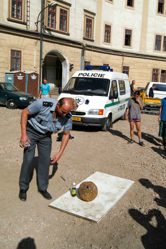 Během archeologického výzkumu bylo na bývalé klášterní zahradě odkryto několik rozsáhlých kráterů a byly nacházeny až šestikilové železné šrapnely po vybuchlých hmoždířových střelách. Nález ze 17. července roku 2003 tedy nebyl zas tak velkým překvapením. Ve vrstvě zahradního horizontu se postupně objevil velký kulovitý železný předmět, který byl identifikován jako nevybuchlá hmoždířová střela. Přivolaný pyrotechnik Policie ČR tehdy nechal přibližně 250 pracovníků archeologického výzkumu evakuovat na přilehlé náměstí a střela byla naložena a odvezena ke zkoumání na Odbor kriminalistické techniky a expertíz. Po konstatování plné funkčnosti byla munice zajištěna podle zákonných norem, tedy jako státní majetek byla určena k likvidaci a deaktivaci.
