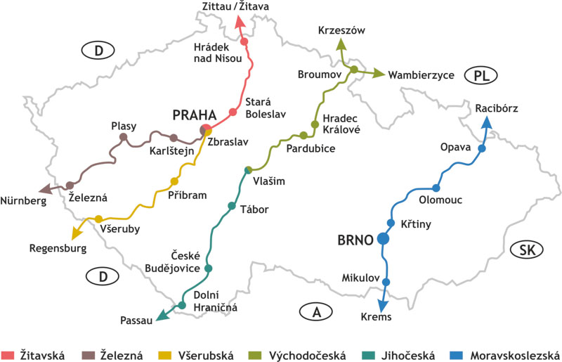 z Prahy). Končí na hranicích s Rakouskem, odkud pokračuje do Santiaga přes Pasov.